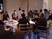 Bei einem weiteren Treffen wählten wir als Form der Vorstellung der inzwischen entstandenen Texte die Kettenlesung, wobei die einzelnen Personen im Rahmen des Ausgangstextes eingefügt wurden, entweder in der Reihenfolge ihres Erscheinens, oder auch, in einem Fall, an einem bestimmten Punkt der Geschichte, an dem ein Exkurs über die Person sinnvoll erschien.