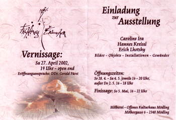 Erich Lhotsky, Carolina Ira und Hannes Kreissl, die sich seit ihrer Ausbildung auf der Graphischen (Malereiklasse Wilhelm Drach) kennen und auch teilweise zusammen arbeiten, haben gerade diese Urkraft in beeindruckender Weise umgesetzt - jeder auf seine Art.
